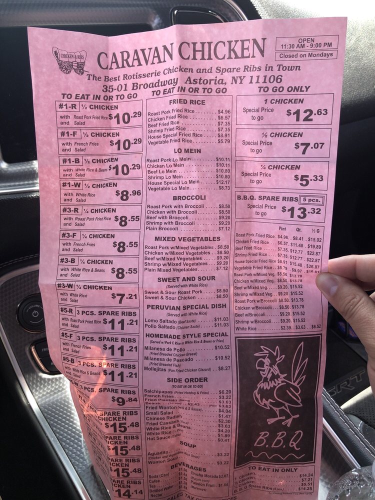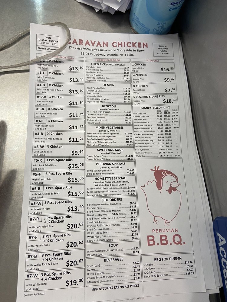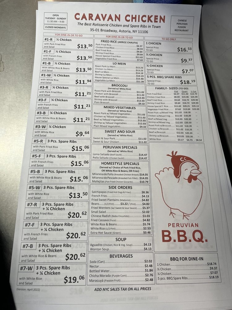 Caravan Chicken, a Latin American-Peruvian gem in Astoria, NY, offers a unique dining experience with its flavorful and delicious dishes. Known for its tender and juicy chicken, perfectly paired with a delectable green sauce, Caravan Chicken also serves up mouth-watering sides like pork fried rice, sweet plantains, and Chinese radish. The generous portions ensure leftovers for a satisfying lunch the next day. Customers rave about the well-balanced flavors, affordable prices, and attentive service. Whether opting for takeout or enjoying a casual dine-in experience, Caravan Chicken impresses with its quality and authenticity. Don't miss out on their lomo saltado, ribs, and signature green sauce – a true delight for your taste buds!